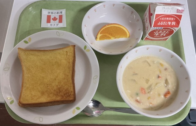 メープルフレンチトースト・牛乳・サーモンチャウダー・くだもの(ネーブルオレンジ)