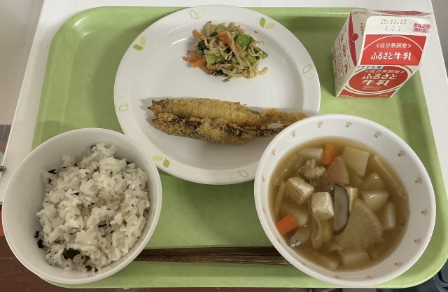 【今日の献立】わかめごはん・牛乳・ししゃものフライ・野菜のごまあえ・けんちん汁