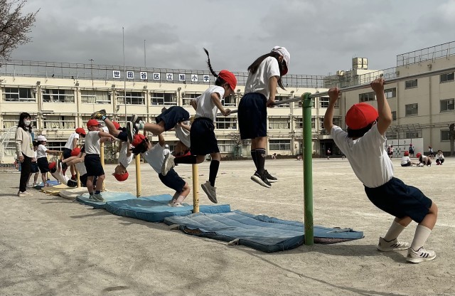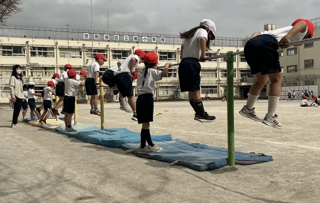 「鉄棒を使った運動遊び」に取り組んでいます。こうもりや前回り下りなど、できるようになった技で楽しんでいました。