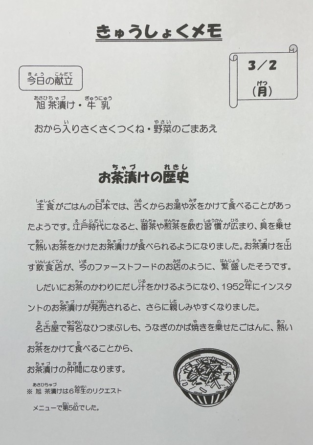 【今日の献立】旭茶漬け・牛乳・おから入りさくさくつくね・野菜のごまあえ