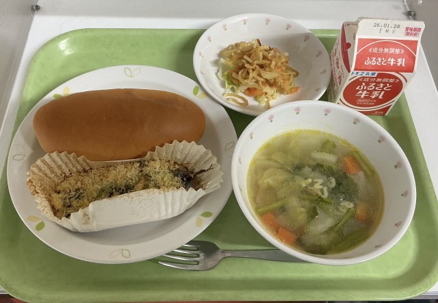 【今日の献立】ミルクパン・牛乳・いわしのガーリック焼き・じゃがいものハニーサラダ・ABCスープ