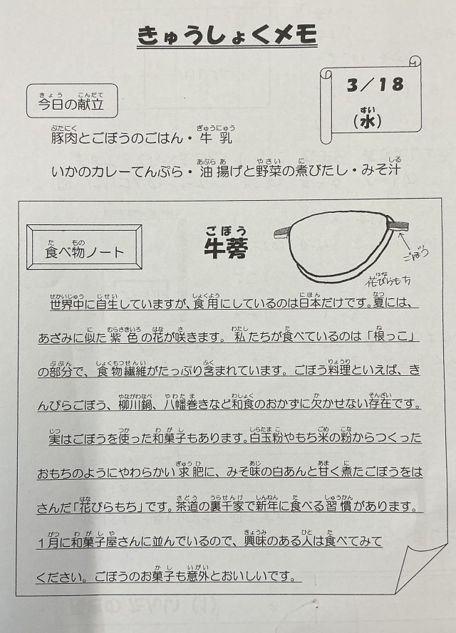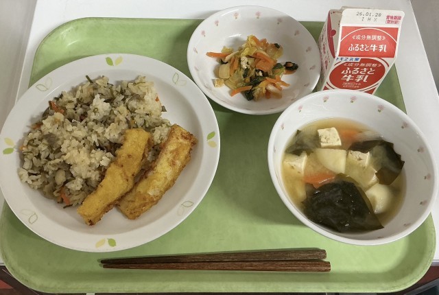 【今日の献立】豚肉とごぼうのごはん・牛乳・いかのカレーてんぷら・油揚げと野菜の煮びたし・みそ汁