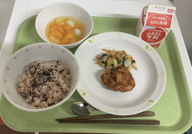 【今日の献立】赤飯・牛乳・鶏肉の竜田揚げ・野菜のおかかあえ・白玉フルーツポンチ