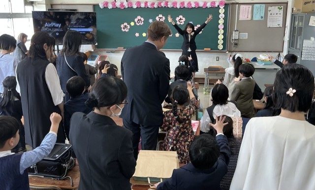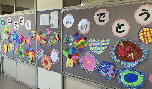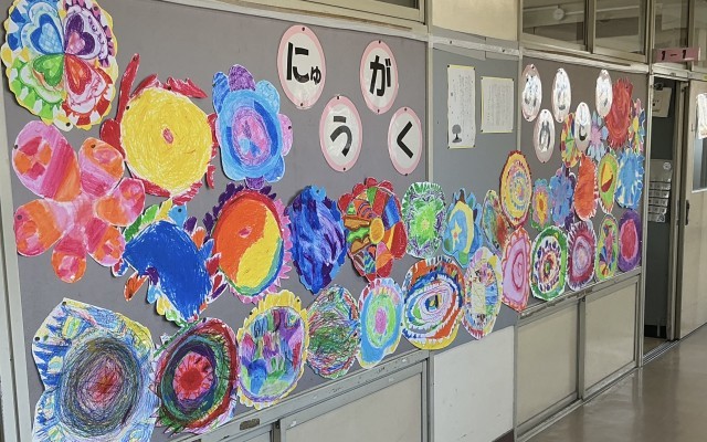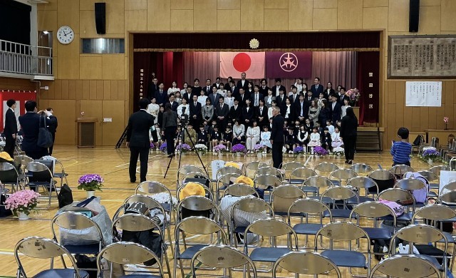 入学式では、2年生が在校生代表として参加し、歓迎の言葉を述べたり、歌を披露したりしました。準備、片付けでは、6年生が大活躍でした。(写真は、1年生の教室、記念撮影の場面です。)