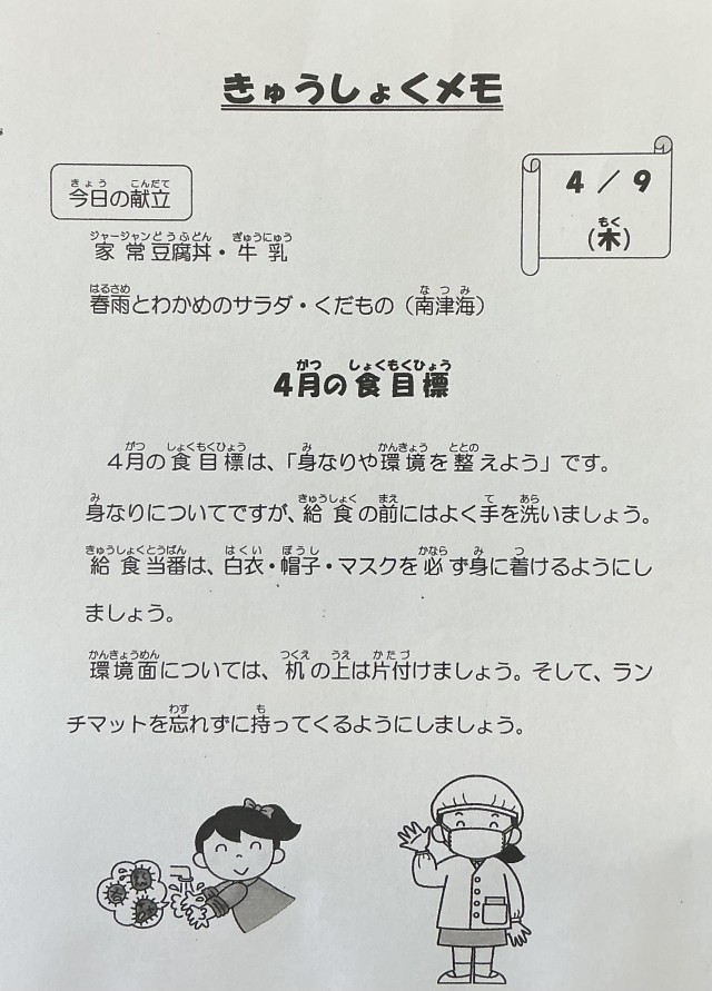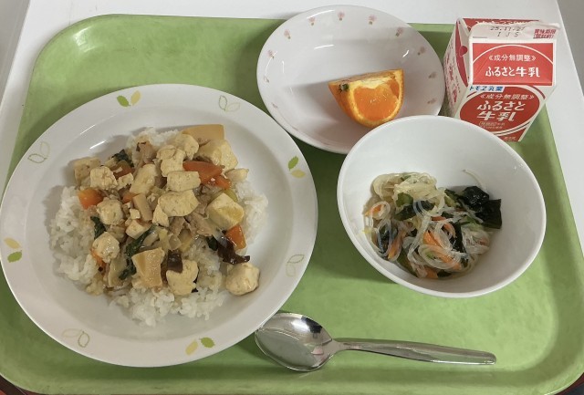 【今日の献立】ジャージャン豆腐・牛乳・春雨とわかめのサラダ・くだもの(南津海)