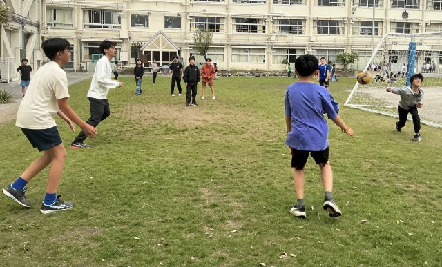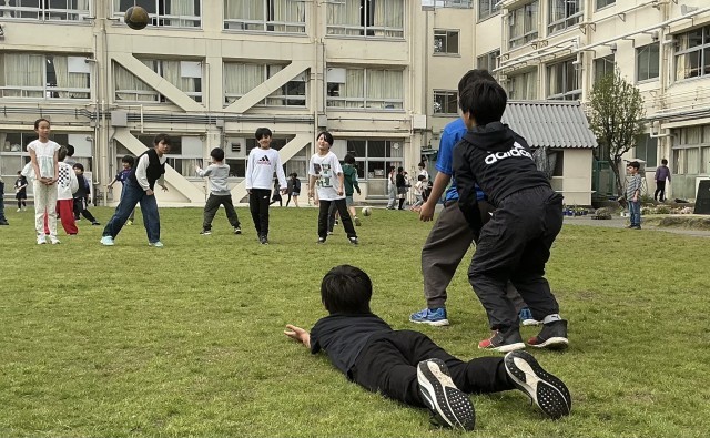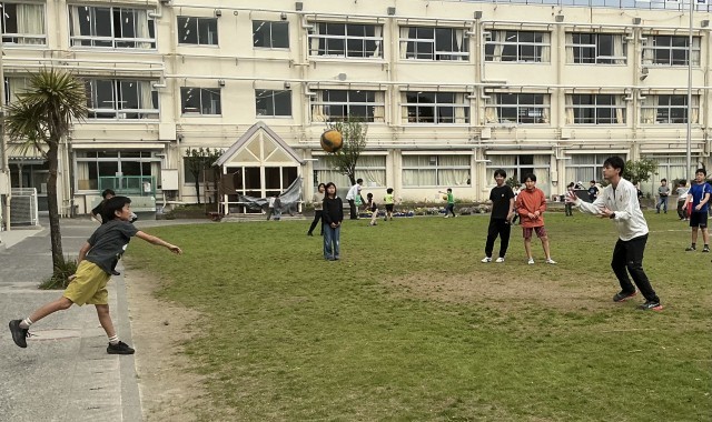 芝生の上での活動は、ドッジボールが人気です。担任も一緒に活動し、子どもたちは嬉しそうです。