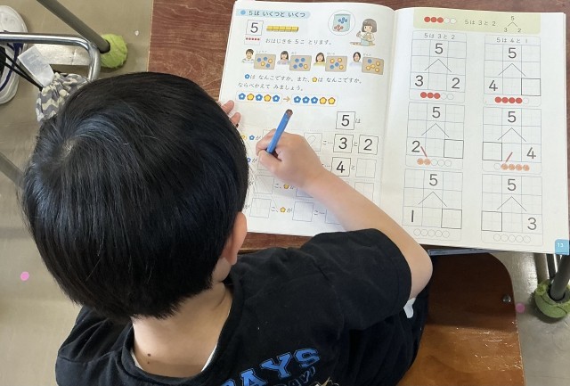 「5は いくつと いくつ」の学習をしています。おはじきを操作しながら考えました。集中して取り組んでいました。