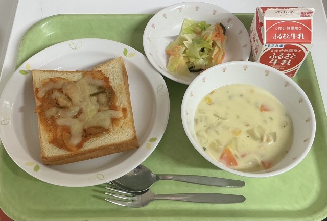 【今日の献立】ツナピザトースト・牛乳・コーンチャウダー・はちみつレモンサラダ