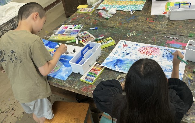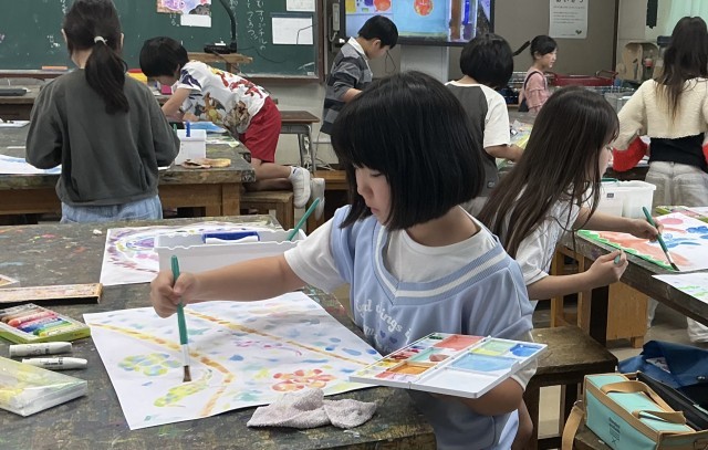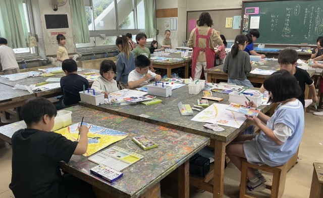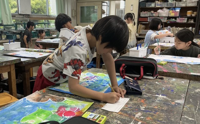 3年生 図工 公開日 2026/04/21 更新日 2026/04/21 今日のできごと 「にじんで広がるものがたり」の学習を進めています。にじみでできる形や色の組み合わせを工夫して作品づくりをしています。 +2