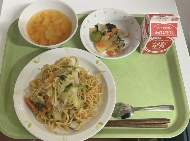 【今日の献立】五目あんかけ焼きそば・牛乳・野菜の中華味・白玉入りフルーツポンチ