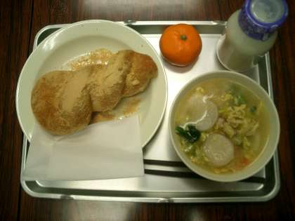 そして、3学期初めての給食は・・・何と!!「卵雑煮」とあげパンです。お雑煮の中には、鶏肉 卵 野菜 そしておもちもたくさん入っています。あげパンは子どもたちの人気メニューです。体も温まり、3学期よいスタートがきれました。