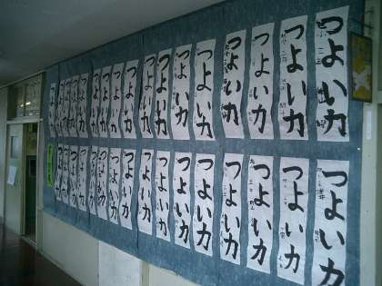 書き初め展 力作が並びました。 その3 公開日 2010/01/21 更新日 2010/01/21 今日のできごと 3年生は、初めての毛筆書き初めです。とめやはらいが練習の時よりもずいぶんと上手になりました。どの子も力強く書けています。