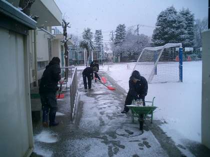 今年2回目の雪かきです。 公開日 2010/02/18 更新日 2010/02/18 今日のできごと 朝方からの雪が地面を少しずつ白くしていきます。前回ほどではありませんが、わずかに積り始めました。辺り一面は真っ白です。 塩化カルシウムを犬走りにまいて、雪をとかしていきます。 子どもたちが登校する頃には、とけていました。 その後のお天気の回復で、昼休みには校庭で元気に遊ぶ姿が見られました。