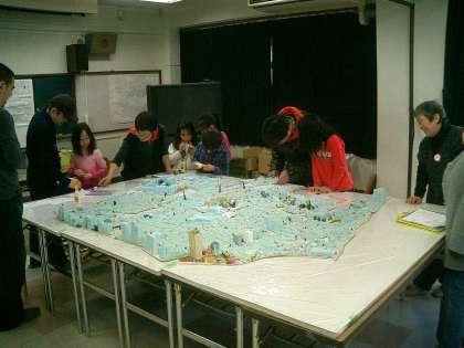 子どもたち11名 おとな10名が旭の町を探検に出かけました。今日は暖かくてよかったです。戻ってきて、さっそくジオラマ作りです。地図をもとにして立体模型を糸のこで切って作り、地図の上にのせていきます。3時間ぐらいかかりましたが、子どもたちも大人も満足そうでした。かかわってくださった皆さん、ありがとうございました。