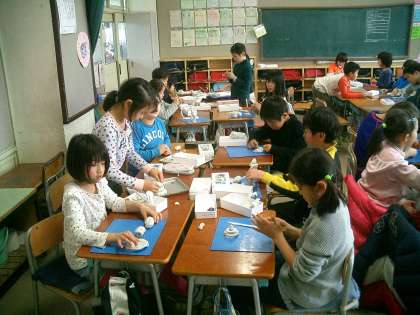 3時間目、1組では図工の時間に、粘土でいろいろな星の形を作っていました。