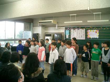 5時間目、音楽室では4年2組の『2分の1 成人式』が行われました。来週から出産休暇に入る戸田先生のお別れ会も兼ねています。