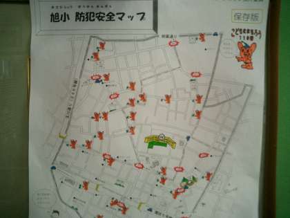 今年度、ブロック校外委員の皆様が、旭小周辺の『防犯安全マップ』を作成してくださいました。本部役員の皆様のご協力もあり、1枚1枚手作業で、マジックインキの色を塗られたそうです。とても感激しました。ぜひ、この『防犯安全マップ』を家庭のわかりやすいところに貼って、活用してください。