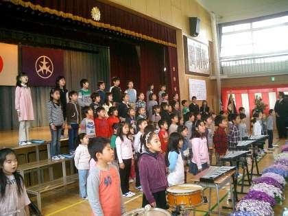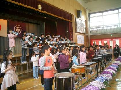 そして、2年生の歓迎の歌です。歌「勇気100%」と合奏「子犬のマーチ」とても元気よく上手にできました。さすが2年生 たくさんの拍手をもらいうれしそうでした。