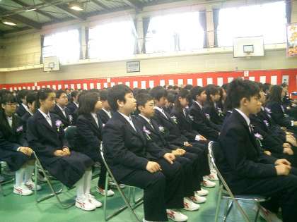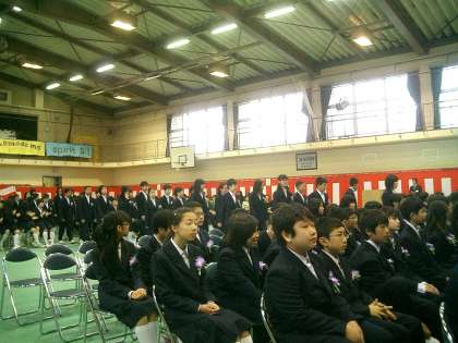 新入生が入場した後、一人一人呼名され、111名の新1年生が揃いました。校長先生のお話のあと、来賓代表として私がお祝いの言葉を贈りました。小学校を卒業してまだ2週間も経っていないのに、制服姿の1年生の凛とした態度に感心しました。記念品を受け取る代表生徒も、誓いの言葉の代表生徒も旭小出身だったので、うれしく感じました。今日から中学生。頑張ってください。3年生、2年生も立派に成長している姿を見て、頼もしく感じた入学式でした。