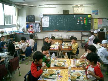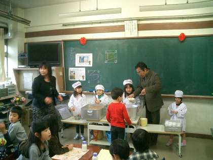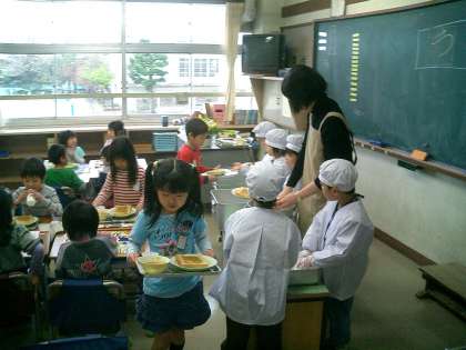 1年生 小学校生活 初めての給食です。 公開日 2010/04/12 更新日 2010/04/12 今日のできごと 今日から1年生の給食が始まりました。初めてなので、4時間目の途中から準備を始めました。しばらくの間は、少し早目に給食の準備を行います。今日のメニューは、「セサミトースト ボルシチ ホワイトゼリー 牛乳」です。当番の子たちは白衣を着て、張り切っています。担任の先生や専科の先生が一緒に手伝います。 そして「いただきます」 皆おいしそうに食べていました。