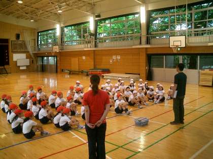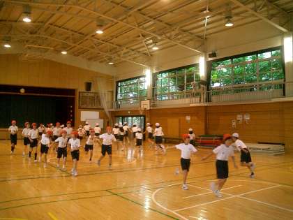 今朝は、チーム決め、チームごとの相談、バトン練習をしました。