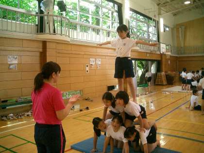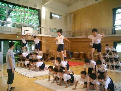 5・6年生 『組体操』 『騎馬戦』 公開日 2010/05/28 更新日 2010/05/28 今日のできごと 5・6時間目、5・6年生は体育館で組体操の練習を 校庭芝生で騎馬戦の練習をしました。今日はピラミッドと三段タワーの練習です。みんなの意気がそろわないとうまくできません。どのグループも成功させるために、どうしたらよいのかを真剣に話し合っています。騎馬戦の騎馬のグループも決まりました。来週一週間の練習でさらに磨きをかけて本番にのぞみます。頑張れ5・6年生!!