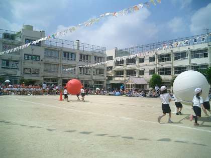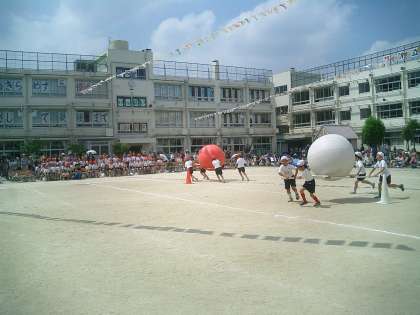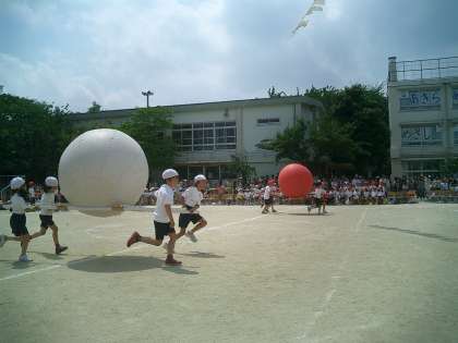 4人のチームワークがそろわないと、大玉がこぼれたり落ちたりしてうまくいきません。