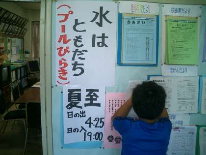 ところで、3枚目の写真は、夏至の今日 昼間の時間と夜の時間を計算している4年生です。全校朝会で一年間で一番昼間の時間が長いのは夏至、今日ですよと話しました。日の出と日の入りの時間で昼間の時間を計算してくる4年生や5年生が15人ほど校長室へやってきてくれました。えらい!!!。