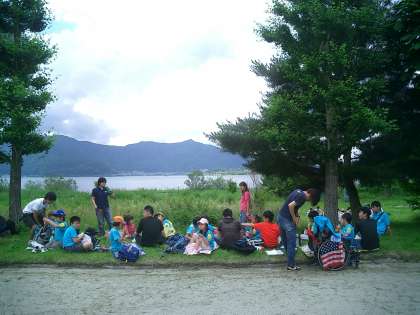 お昼前に宿舎に到着。湖畔でおいしいお弁当をいただきました。