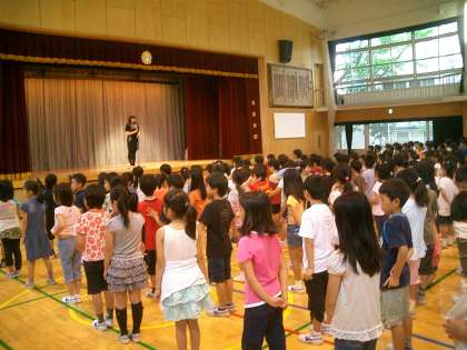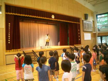 今朝は小雨が降っていたので、体育館で全校朝会を行いました。