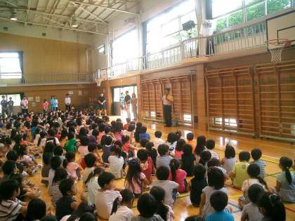 校内放送で、全児童が体育館へ避難。その後、警察の方のお話を聞きました。