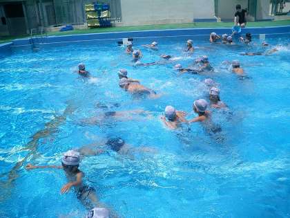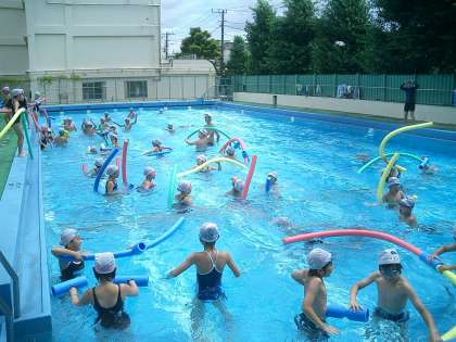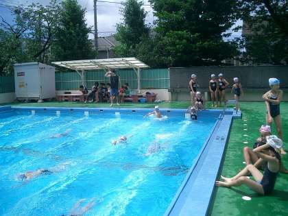 今日も絶好のプール日和!!(4年生 2年生) 公開日 2010/07/14 更新日 2010/07/14 今日のできごと 梅雨の合間で、はっきりしない天候が続いていますが、今日は太陽が輝き、絶好のプール日和になりました。 2時間目に4年生、3・4時間目は2年生がプールで歓声をあげました。とても気持ち良さそうです。一緒に入りたくなってしまう気持ちをおさえて、写真を撮りました。 1学期最後のプールの学年もあり、宝探しをしたり器具や用具を使って過ごしたりして楽しんでいました。