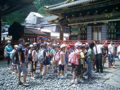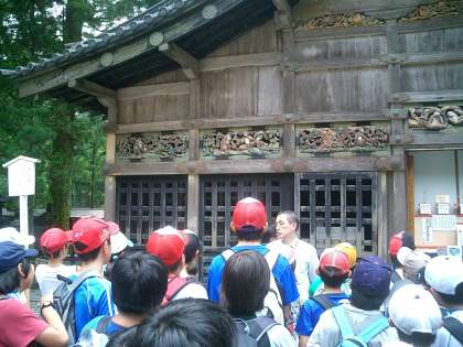 日光林間学園 その4 【東照宮にて 2】 公開日 2010/07/30 更新日 2010/07/30 今日のできごと 『見猿 言わ猿 聞か猿』の三猿を見学した後は、左甚五郎作の『眠り猫』を見ました。徳川家康公のお墓まで何百段の階段を昇り降りしました。疲れました。