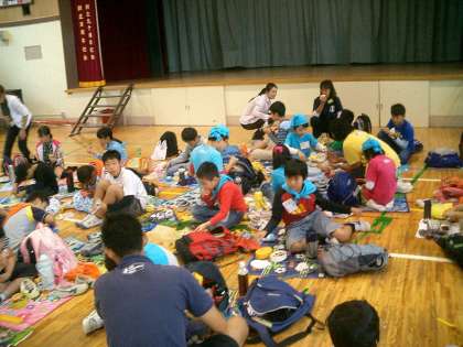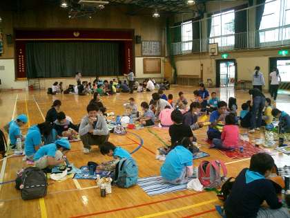 体育館で大きなグループを二つ作って、ほかの学校の友達と仲良くお弁当を食べました。おいしそうに食べています。