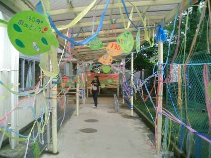 体育館に通じる渡り廊下の装飾が、5年生の手によって飾り付けられました。6年生のメッセージカードは、正門沿いのフェンスに。5年生のメッセージカードは体育館に通じる廊下に飾ってあります。130周年のお祝いの言葉とともに、それぞれのメッセージが書き込まれています。5年生ありがとう。