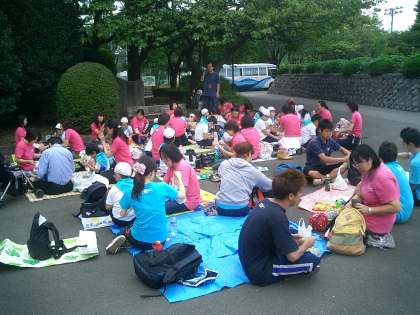 おもしろいことに、毎年旭のお弁当の場所が決まっているのです。体育館に一番近いところに旭のピンクのユニフォームが、子どもたちの青いバンダナが目立ちます。