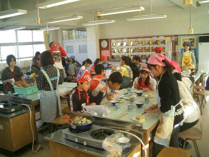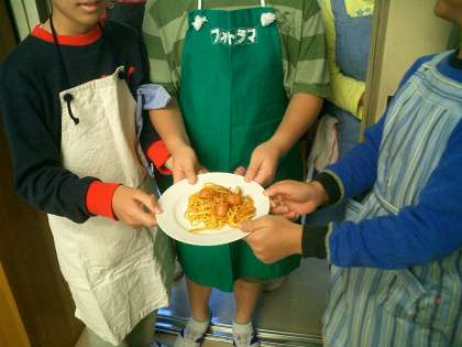 班ごとにいろいろなメニューを作りました。作っている時の楽しそうな顔、包丁づかいもたいしたものです。私はスパゲティーナポリタンとオニオンスープ、卵のサラダなどをごちそうになりました。焼きそばや炒め物のグループもあり、とてもおいしく幸せそうに食べていました。ごちそうさまでした。
