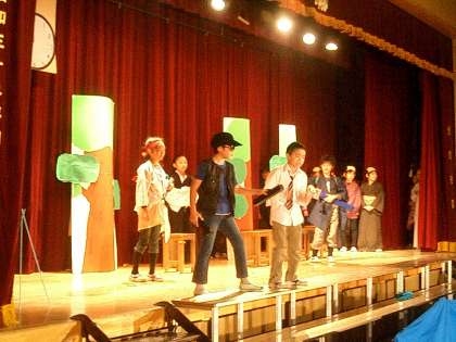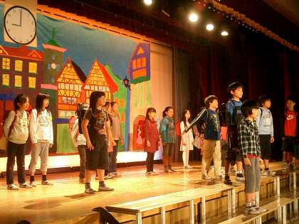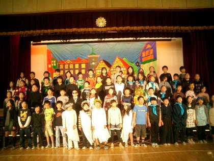 130周年記念学芸会 その6 4年生『モモと時間泥棒』 公開日 2010/11/27 更新日 2010/11/27 今日のできごと 楽しくてテンポが速い構成の劇を、4年生が自分たちの力をフルに発揮し、仕上げました。巌流島の決闘は佐々木小次郎と宮本武蔵の一騎打ち・・・アレッ武蔵が負けちゃった!???。でも、映画の撮影だったんですね。安心しました。 最後の全員合唱の美しいハーモニー 素敵でした。