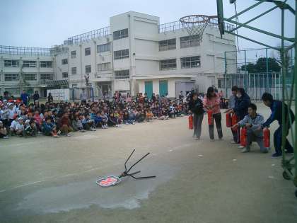 火事を想定しての消火訓練ということで、先生方が水消火器を使って消し止めました。