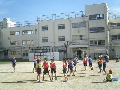 4時間目、校庭では2年1組がドッジボールをやっています。