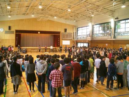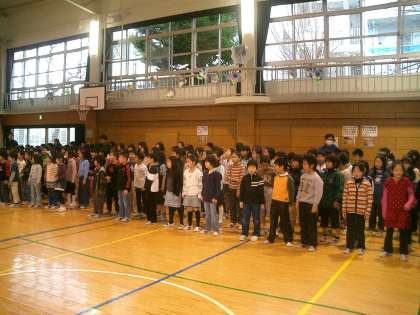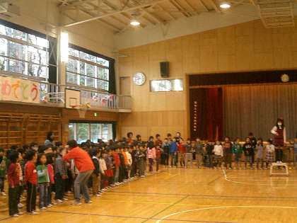 2学期最後の音楽朝会は、1・2年生は『あわてんぼうのサンタクロース』3〜6年生は『翼をください』を歌いました。