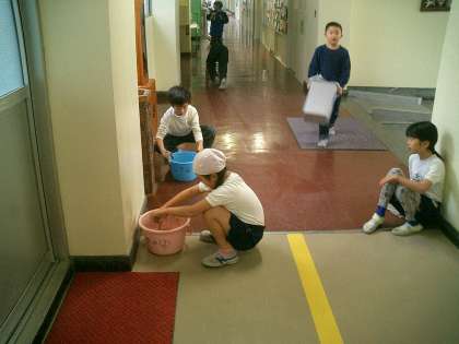 昼休みが終わると、そうじの時間です。旭小は一斉清掃です。