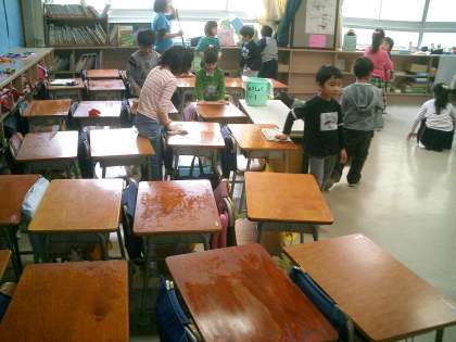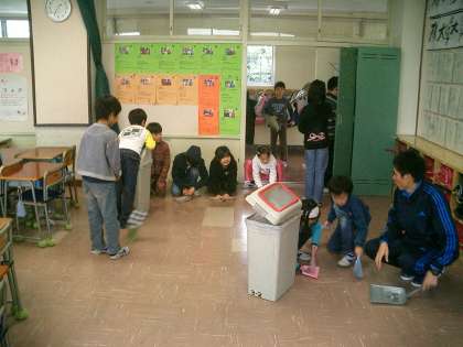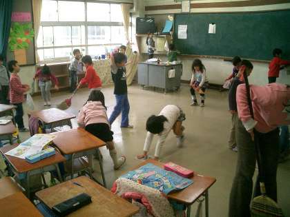 そうじの時間 みんなで協力しあって その2 公開日 2010/12/21 更新日 2010/12/21 今日のできごと 2階の教室は、1年生から3年生そしてひまらや学級です。 教室をのぞくと、先生と一緒に教室をきれいにほうきで掃いています。 掃きそうじが終わると、今度はぞうきんがけです。 家庭では、ほうきで掃いたり、ぞうきんがけをしたりする機会がすくなくなりましたが、みんなで協力しあって教室をきれいにするのは、とても気持ちが良いことです。