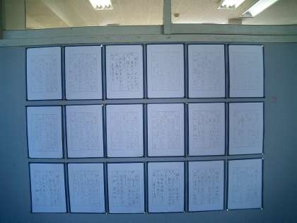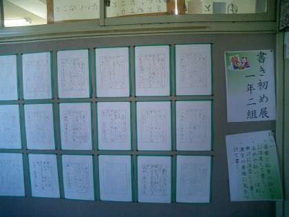 書き初め 間に合いました。 その1 公開日 2011/01/31 更新日 2011/01/31 今日のできごと 公開週間から各教室の廊下壁面に掲示してあった『書き初め』。 今日が1月最後なので、担任の先生方が他の図工作品や絵に替えている様子が見られました。急いで、各学年の書き初めをデジカメで撮って回ったのですが、いくつかの学級とひまらや学級はすでに他の掲示物に替わっていました。残念!! どの書き初めにも、一人一人の子どもの心が伝わってきます。よく頑張りました。