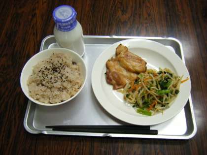 そして、今日の給食は、お誕生日をお祝いして『お赤飯 鶏肉の照り焼き 野菜のごままだれかけ くだもの 牛乳』の豪華版でした。