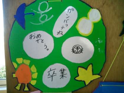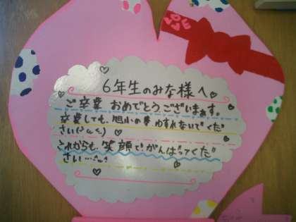 6年生の卒業をお祝いして、5年生が作りました。 公開日 2011/02/23 更新日 2011/02/23 今日のできごと 3月1日に行われる『6年生を送る会』の練習が、学年ごとに始まっています。 内容は当日のお楽しみです。各学年、頑張って練習しています。 2階・3階の廊下には、5年生が図工の時間に作成した「お祝いボード」が展示されています。1年先輩の6年生の卒業をお祝いして、いろいろな言葉や絵が描かれています。 見ていて、とても心が温かく和んできます。来校された際にぜひご覧ください。