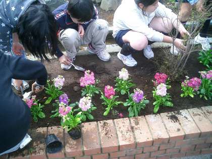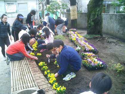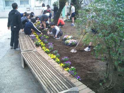 正門前の花壇には、黄色の美しいビオラが、となりの花壇にはストックという花が6年生の手によって植えられています。一鉢一鉢大切に持ちながら、スコップで掘った土の中にていねいに植えていきます。