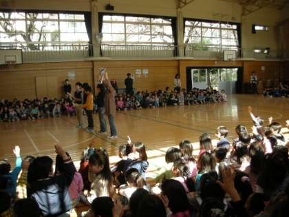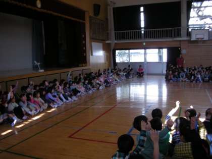 「1年生を迎える会」がありました。今週の月曜日から全校朝会に参加し、給食や休み時間の外遊びも始めている1年生ですが、今日、改めて、旭小学校の仲間入りです。
