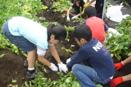 6/13 じゃがいも掘り(4年) 公開日 2011/06/13 更新日 2011/06/13 今日のできごと 今日の午前中、4年生が「じゃがいも掘り」に出かけました。世田谷区の「自然の教室」(自然体験学習)の1つです。秋山農園さんからの説明をお聞きし、作業に取り掛かりました。少し湿っていたものの、土は柔らかく、次から次へとたくさんのじゃがいもを掘ることができました。中には、子どものグーよりも大きな物があり、子ども達は笑顔いっぱいでした。