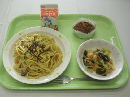 献立は、和風スパゲッティ、牛乳、わかめサラダ、おからマフィンでした。